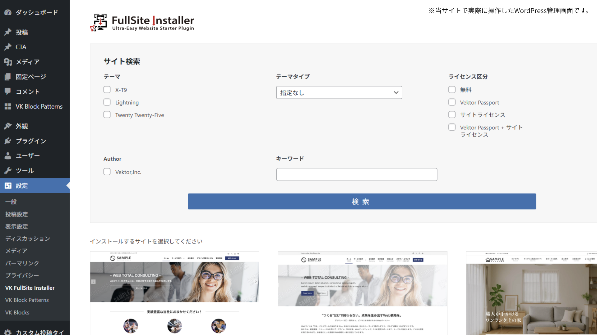 VK FullSite Installerを利用すると、WordPressの基本設定も含めてインポートすることができます。